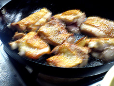 キッチンペーパーで水気を取った鶏を、皮目から入れて焼く |