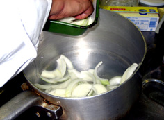 厚手の鍋にオリーブオイル大さじ1を入れ、最初に玉ねぎから炒める。ここで塩を少々加える。この塩は味付けではなく、野菜のうまみを引き出すため |
