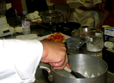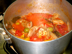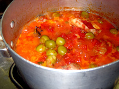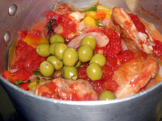 グリーンオリーブも えて、フタをして約15分ほど煮込む。この時、全体を掻き混ぜずに、自然に沸騰させるようにする |
