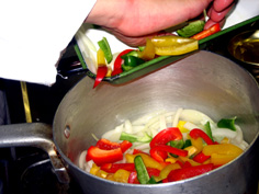 玉ねぎが少ししんなりしたらパプリカ、ピーマンを加え、最初強火、次に中火に。ここでも塩を少々加える |