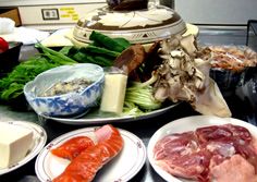 材料 6人分 ※鰹 し材料 水 2ℓ 削り節 60g(3%) 薄口醤油・ミリン 各、漉した後の出し汁の12/1 ※寄せ鍋材料 きのこ各種・くずきり・わけぎ(小ネギ)・小松菜・水菜・豆腐・鶏モモ肉・牡蠣・生鮭・焼きもち・蕎麦 |