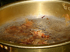 次に鮭と、ほぐした椎茸の石づきを入れ軽く煮る |