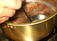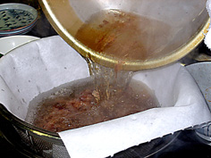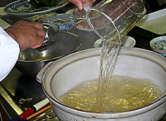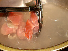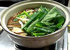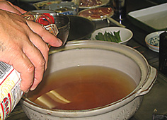 薄口醤油・ミリンを、それぞれ出し汁の12/1 える。寄せ鍋の味は 12:1:1 が基本。 |