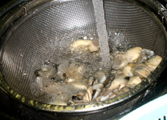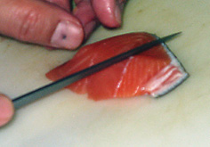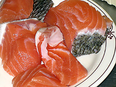 同じ鍋で、生鮭も霜ふる。鮭は、さっとで良い。水に取らない。 |