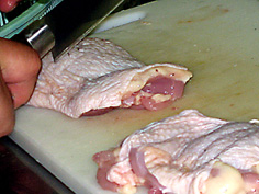 鶏モモ肉は、庖丁の根元の角で両面を突いておく |