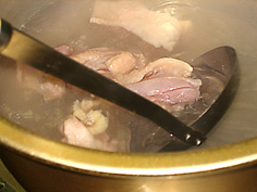 鍋にお湯を沸かし、鶏から霜ふる。表面が白くなったら引き上げ |