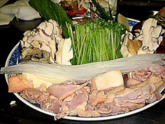 きのこや野菜等、火の通り具合をみながら えて食す。最後に焼もちや蕎麦を入れる |