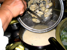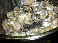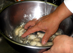 カキは少量の塩と片 粉をふりかけ、揉まないように気をつけて洗う。2~3回洗ってからザルに取り、少し置いておくとプリッとする |