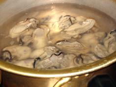 ここに砂糖大さじ2弱、塩少々、コショウ少々を え少し煮る。カキが温まり、少し味が出るくらいまで。少し甘めの味付けにする |
