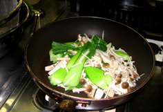フライパンにゴマ油大さじ1を引き、キノコとチンゲン菜を炒め、塩、コショウ、酒各少々をふり味をつける |