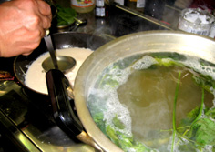 中華スープにセロリの葉、パセリ、ネギの青いところ、ショウガの皮などを加えてスープを作っておく |