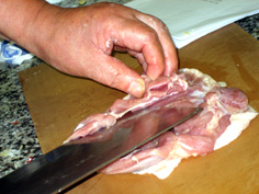 庖丁の手前の角をあてて、筋を切る |