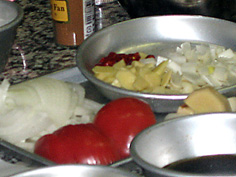 トマトは半分に切ってから薄切り。玉ねぎも同様に薄切り。ネギ、ショウガ、にんにくは小口の薄切り。唐辛子は種を取り、輪切り |