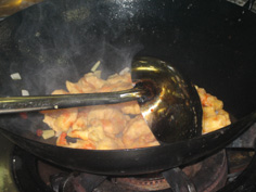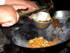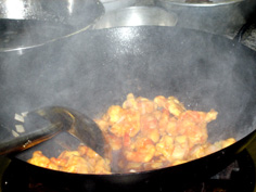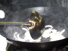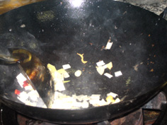 空いた中華鍋に油少々を え、ネギ、ショウガ、にんにく、唐辛子を炒める |