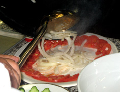大皿にトマトを飾り、炒めた玉ねぎをのせる |