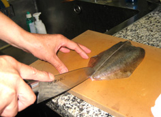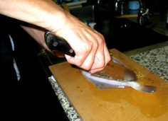 真ん中に庖丁をあて、骨にそわせて身を切る |