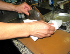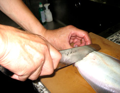 背の真ん中に庖丁をあて |