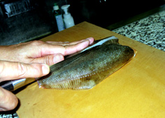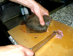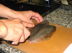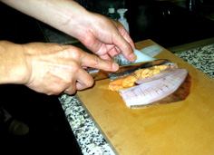 今回は腹側を煮付けにするので、骨つきのまま軽く切れ目を入れる。背の切り身は揚げおろし煮に使う |
