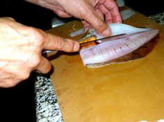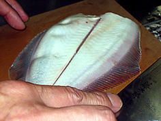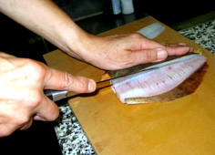 このようにして腹側も切ると、五枚おろしになる |