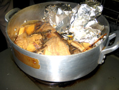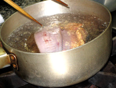 鍋底に竹の皮を敷き、鰈をのせる |