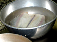 鰈を熱湯にさっとくぐらせ、霜ふりをする。筍も湯通しして切る。 |