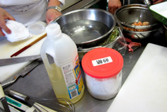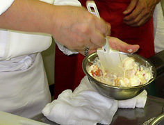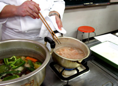 小エビを加えてから塩、白コショウで味を整え、EVオリーブオイル少々で香りをつけてソースにする | |