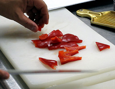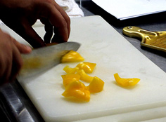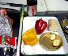 次に山芋から入れて軽く火が通ったら、ピーマンを加え油通し |