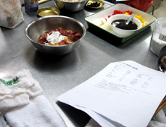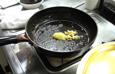 同じフライパンに油大さじ1を足し、おろしたショウガとにんにくを炒める。 |