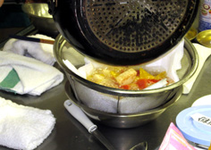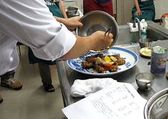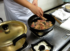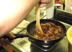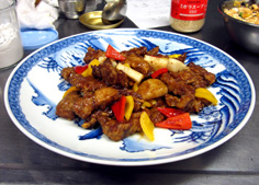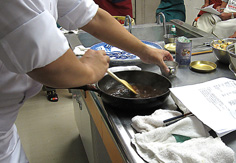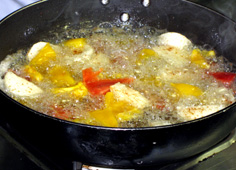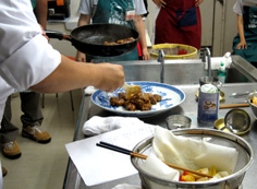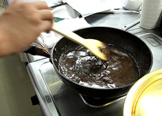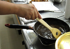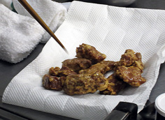 揚げた肉を加え、タレをからめる。タレに入れるのは肉だけ |
