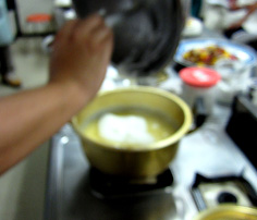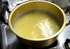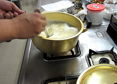 鍋を沸かす。片栗粉が底に沈んでいるので掻き混ぜてなじませる |