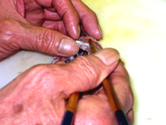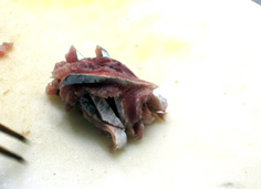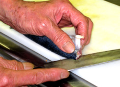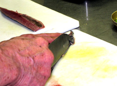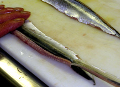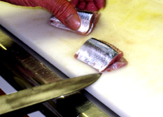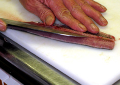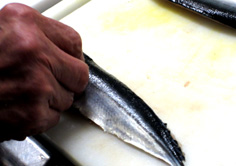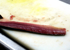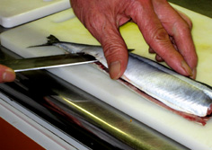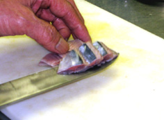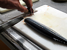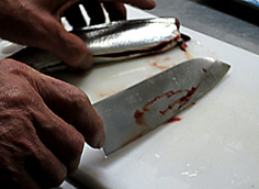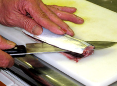 腹骨をすく。庖丁を寝かせて切ること |