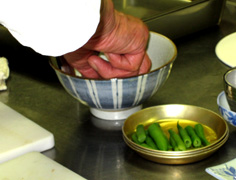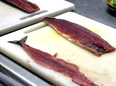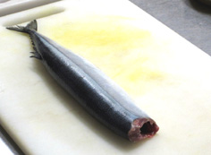 秋刀魚に薄塩をしてから、酢の中で軽く酢洗いをする |