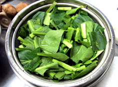 青菜は3〜4センチほどに切り、水洗いをしてザルにとる |