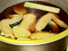 鍋に調味料を入れて火にかけ、沸いたら鶏手羽先とネギ、ショウガの薄切りを入れて煮込む |