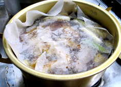 クッキングシートを落し蓋にして、弱火で15〜20分煮込む。時間が経ったら火を止め、そのまま置く。長く煮込んで、脂が抜けすぎても良くない |