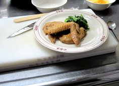 皿に手羽先と青菜を盛る |
