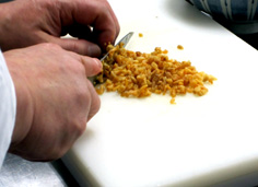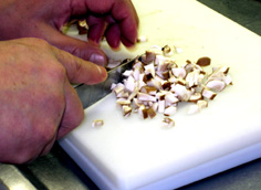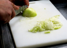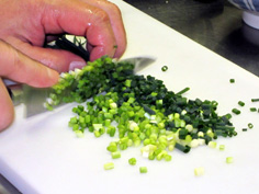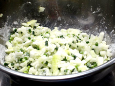 最後に玉ねぎとスリムネギを入れる。この時は、ザックリと混ぜること。 |
