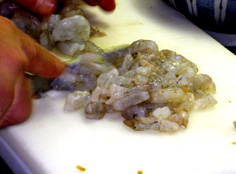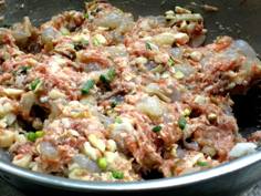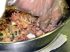ボールに挽肉とエビを入れ、粘りが出るまで混ぜ、調味料を入れ、また混ぜる |