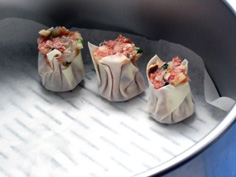 蒸し器にクッキングペーパーを敷き、包んだシューマイを並べる |