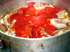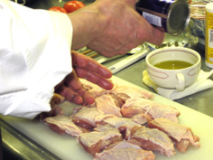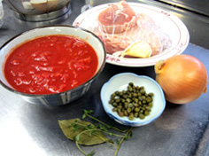 かぶる位の水を入れ、ケッパー、タイム、ローリエと一緒に煮込む。ローリエを少し火にあぶると、香りが出る |