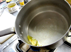 鍋にオリーブオイルとにんにくを入れてから、火にかける。にんにくがこんがりと焼色が付くまで |