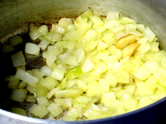 にんにくの鍋で、玉ねぎを透明になるまで炒める |