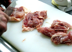 鶏モモ肉は、モモの上の方の大きい所は四つに、下は三つに切る |