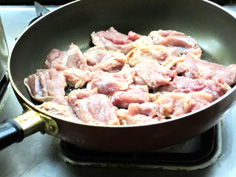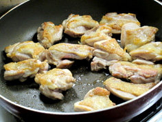 フライパンに油は引かず、鶏の皮目を下にして並べて焼く |