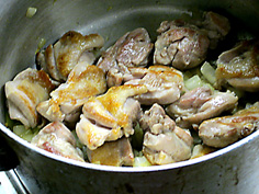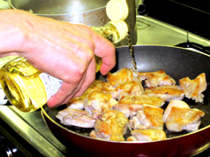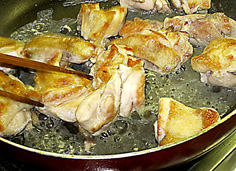 6分ほどで火が通る。鶏モモ肉は取り出し、残ったソースを煮つめ、味を整える |