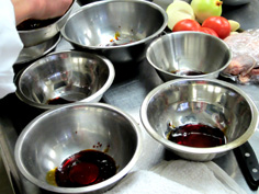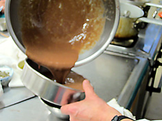 プリンカップの底に流し込みます。ここでは、大きく作るのでボールに入れている |