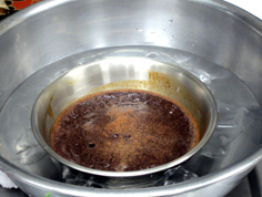 カラメルを流しておいたボールに入れて、オーブンの鉄板にのせる。 鉄板の八分目位までお湯を張る。 |