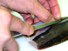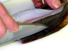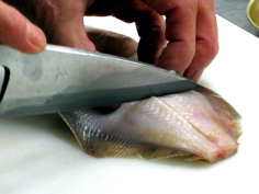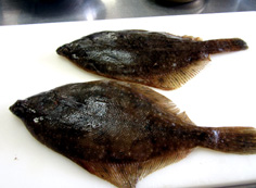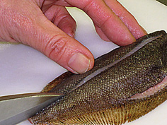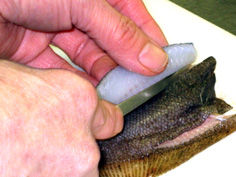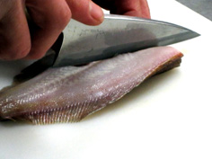 鰈のうろこを両面取り、水洗いする。 を落とす。 |