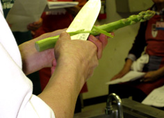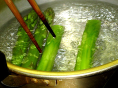 アスパラガスは根元の硬いところの皮をむき、半分に切る |