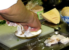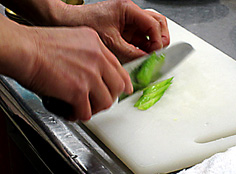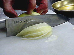 玉ねぎは繊維に直角に薄く切り、水にさらす |